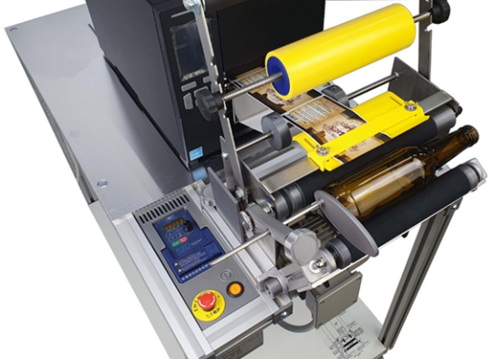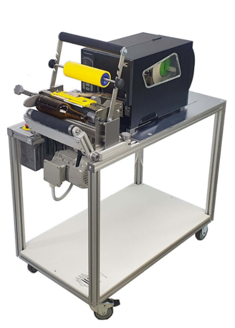 The ET-02 S is a manual labeling device for round bottles, equipped with a built-in thermal transfer printer for printing and applying labels in one step. It supports barcode printing, quick calibration, and can also print batch numbers and dates directly on the labels.