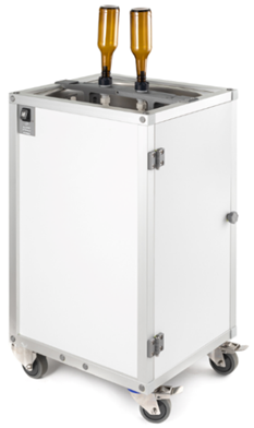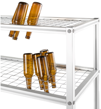 The drying rack is a mobile two-level stand for drying bottles, holding around 100 bottles and featuring a lightweight aluminium frame, stainless-steel wheels, and a galvanized grid.