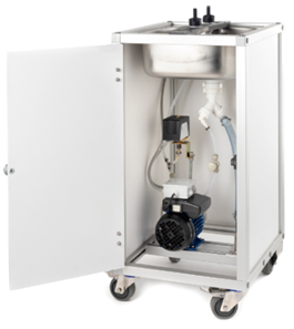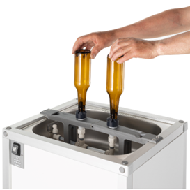 The cleaning station is a two-head bottle disinfection unit with automatic pump start and stop, a stainless steel tank, integrated pressure switch and non-return valve, and four wheels for easy handling.